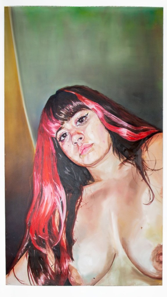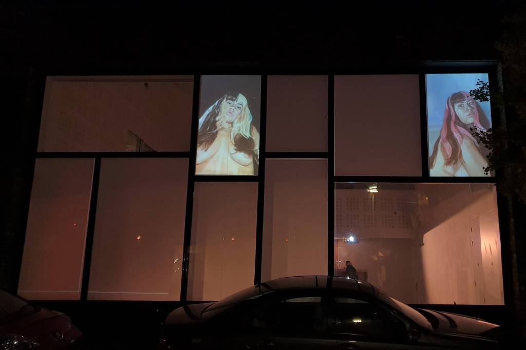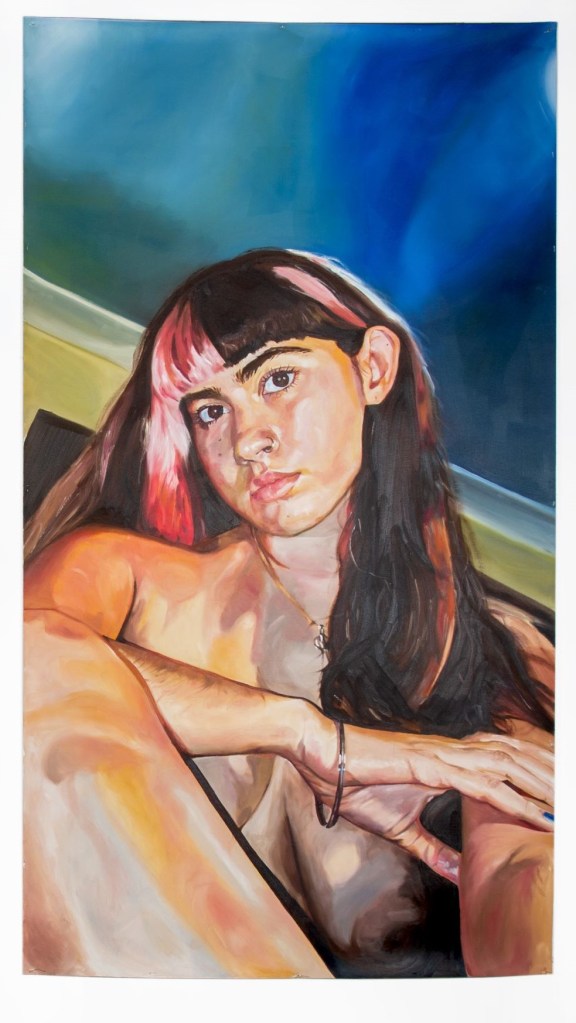 Self Portrait, Late Home, 2021, oil on canvas, 186.5 x 105 cm.Sketch, 2021, pencil on paper, A4.Self Portrait, Hand Resting on my Arm, 2021, oil on canvas, 186.5 x 105 cm.Digital Projections of Self Portrait, Sitting Up, and Self Portrait, Looking over my Shoulder, on the window of 128 Bullingdon Road, facing inwards and outwards, 2021.Self Portrait, Sitting Up, 2021, oil on canvas, 186.5 x 105 cm.